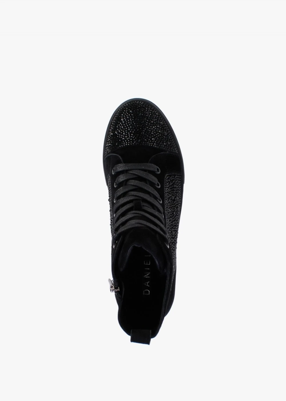 The ‘Sellish’ high top trainers are part of the New Season collection from Daniel Footwear. This off duty style is crafted from a premium suede upper with cosy textile fleece lining and a comfy rubber sole. Zip fastening to the inner leg creates an easy wear and the lace up upper ensures the perfect fit. Tab to the top-line adds detail as well as scattered diamante embellishment to the upper. Signature Daniel branding is seen to the foot-bed.