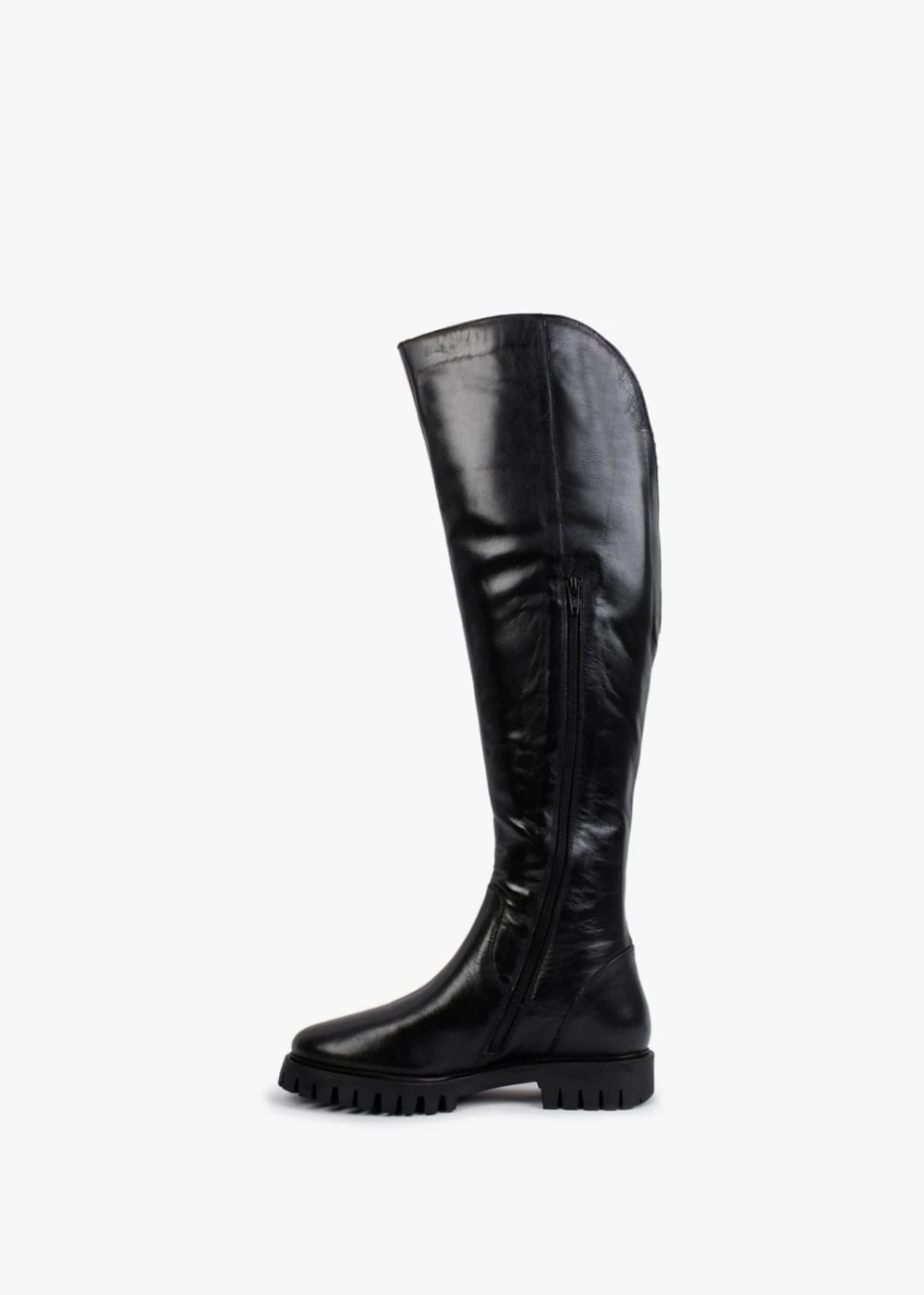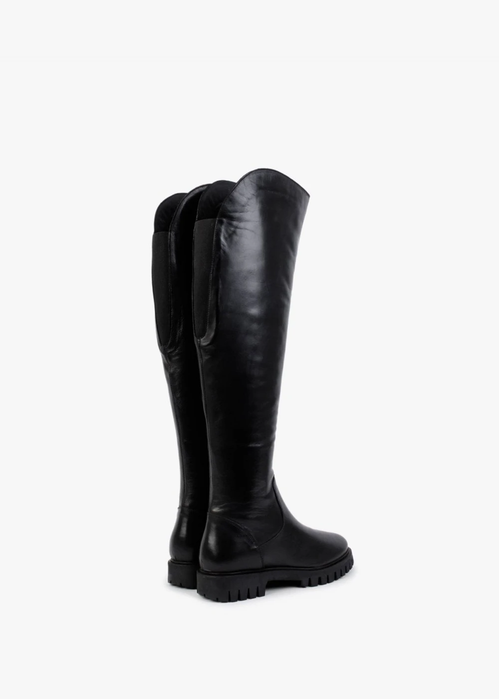 Add the ‘Sicty’ over the knee boots from Daniel Footwear to your Winter wardrobe. This everyday style is crafted from premium leather with part leather lining and a cleated rubber sole. Half zip fastening to the inner leg creates an easy wear as well as the elasticated insert. Subtle tonal top stitching and raised seaming add detail to the upper. The round toe and flat heel make up the silhouette. Signature Daniel branding is seen to the foot-bed.