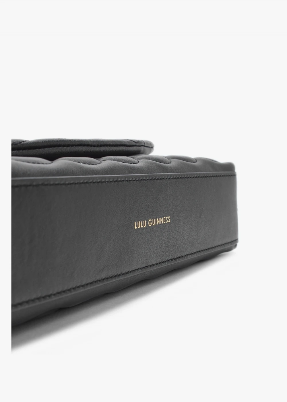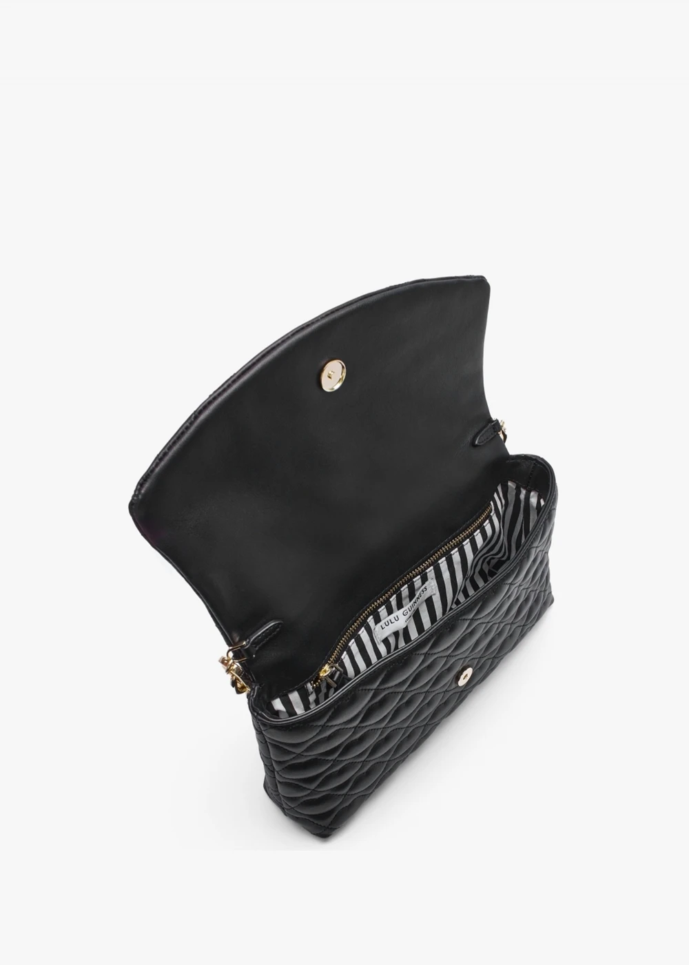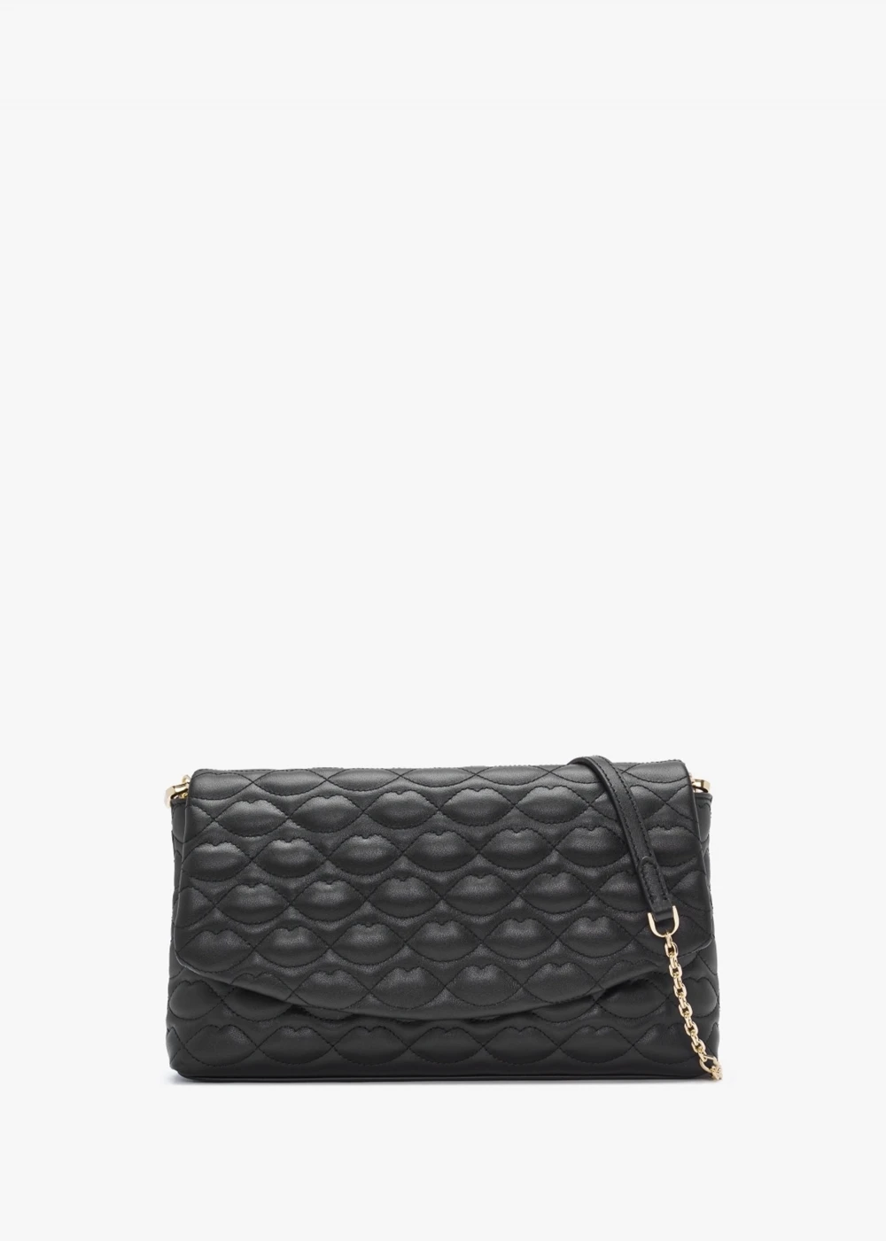 The ‘Tara’ clutch is part of the New Season collection from Lulu Guinness. This classic style is crafted from premium leather in a quilted lips design with polished gold tone hardware. The secure magnetic snap front flap fastening reveals cotton lining and features handy inner zip pocket. Use as a clutch or carry by either the chunky chain shoulder strap or the detachable lips chain strap. Signature Lulu Guinness branding is seen throughout.