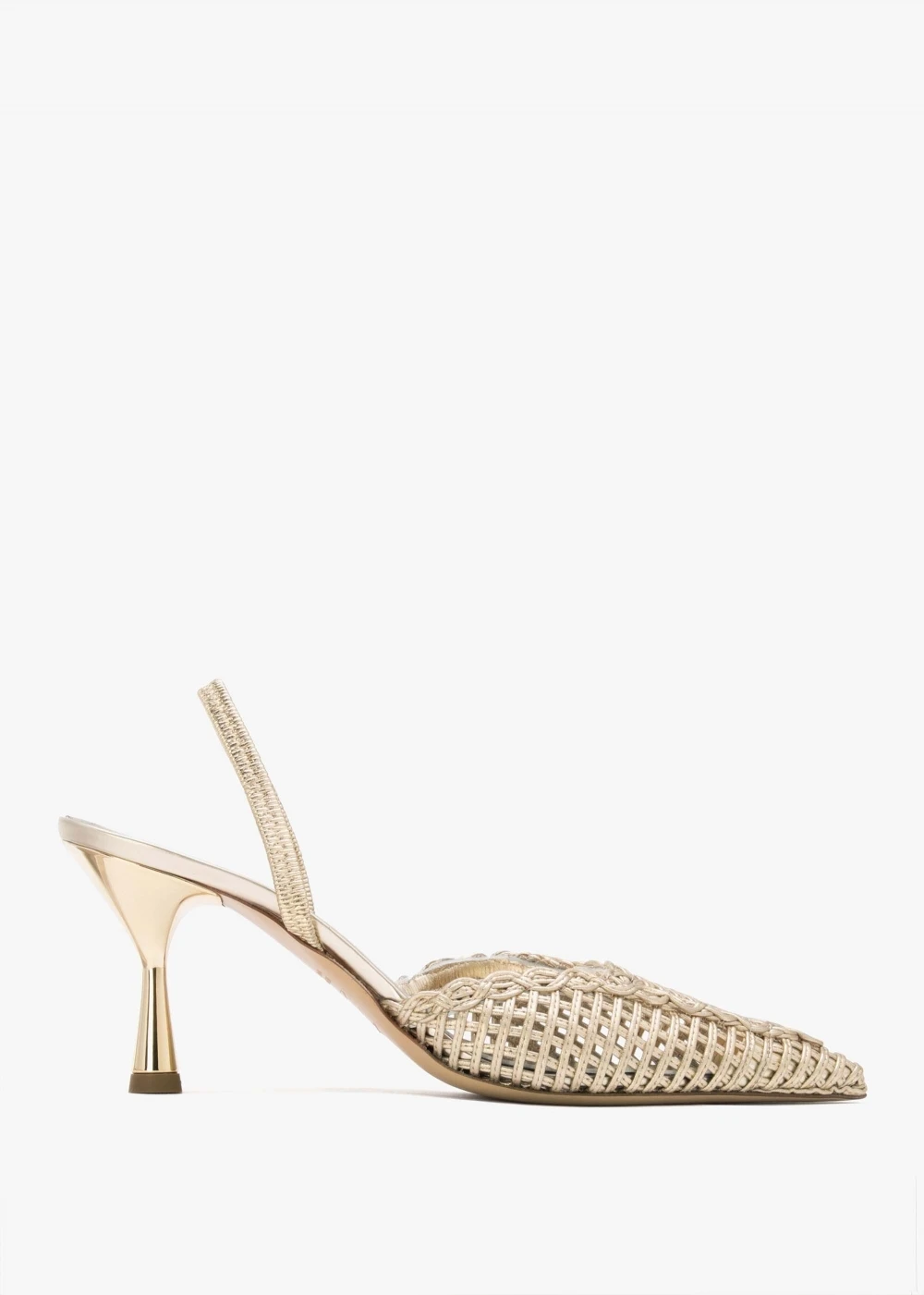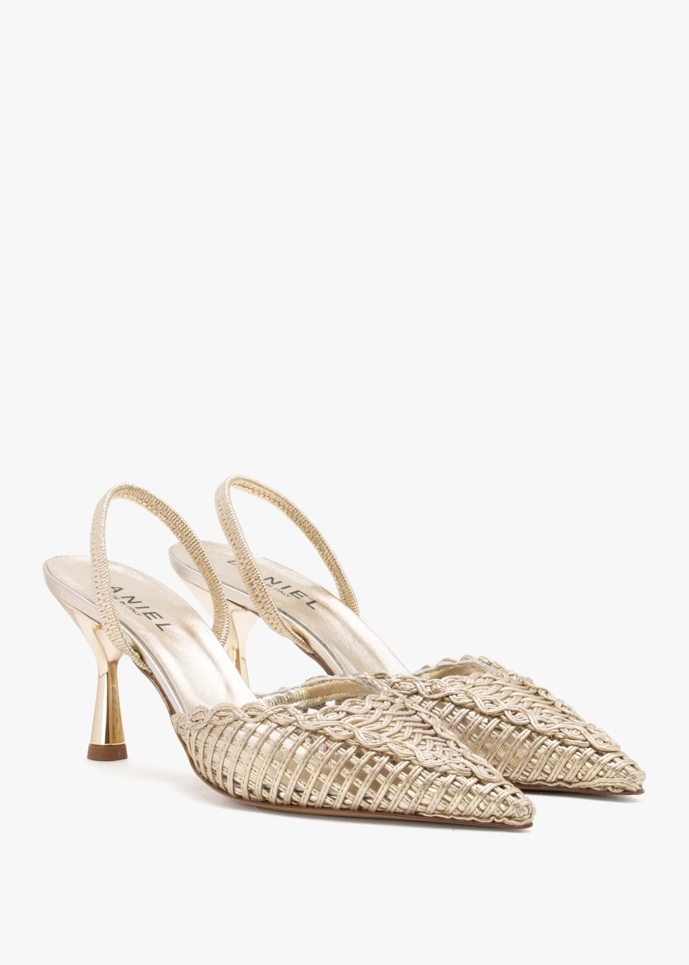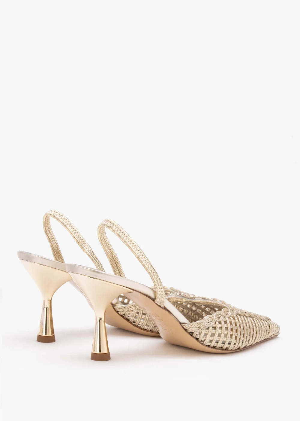 Be the first to review “Tiffi Gold Leather Woven Sling Back Mid Heel Shoes” Cancel reply