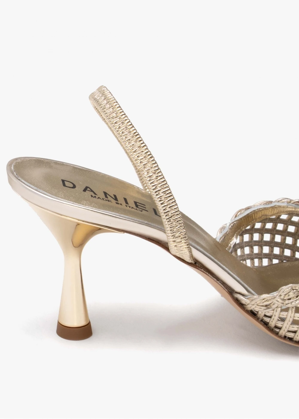 The ‘Tiffi’ sling back heeled shoes from Daniel Footwear elegantly frames the foot. A must have style that will take you from day to dark seamlessly. Crafted from a premium leather upper in a chic woven design with luxurious leather lining and sole. An easy to wear slip on style featuring elasticated sling back. The classic pointed toe and shaped mid heel make up the silhouette. Signature Daniel branding is seen to the foot-bed. These bestselling heels can by styled with practically anything.