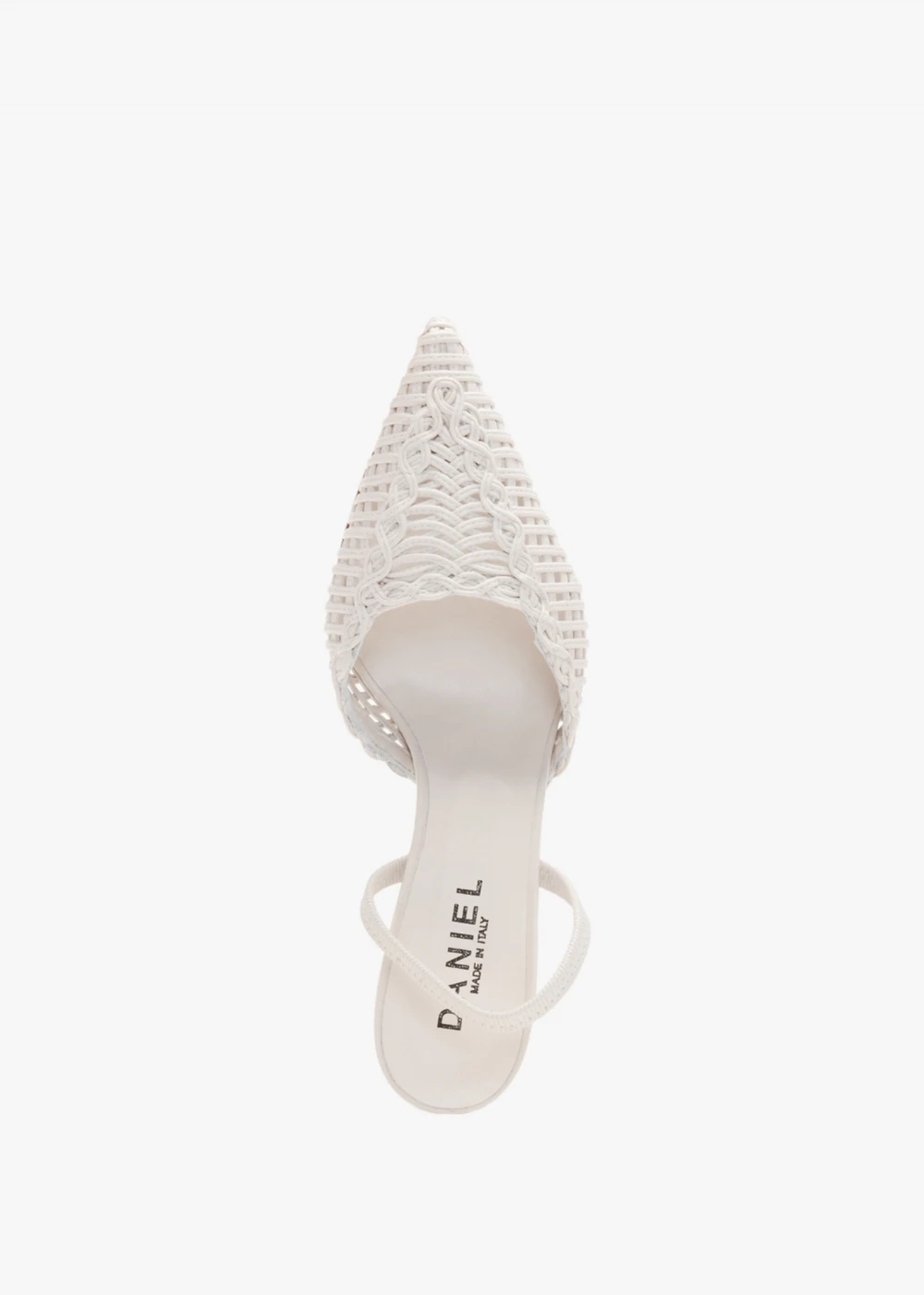 The ‘Tiffi’ sling back heeled shoes from Daniel Footwear elegantly frames the foot. A must have style that will take you from day to dark seamlessly. Crafted from a premium leather upper in a chic woven design with luxurious leather lining and sole. An easy to wear slip on style featuring elasticated sling back. The classic pointed toe and shaped mid heel make up the silhouette. Signature Daniel branding is seen to the foot-bed. These bestselling heels can by styled with practically anything.