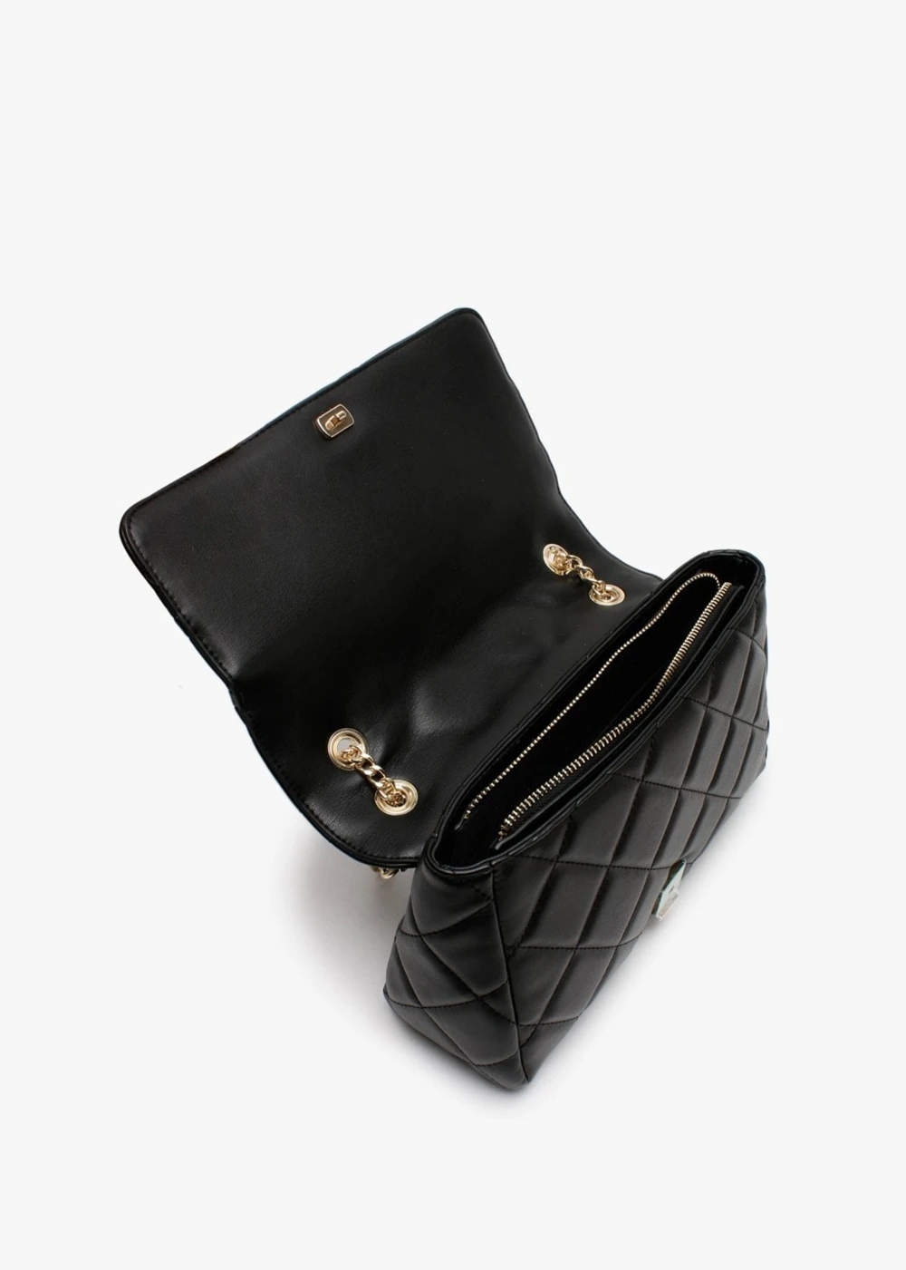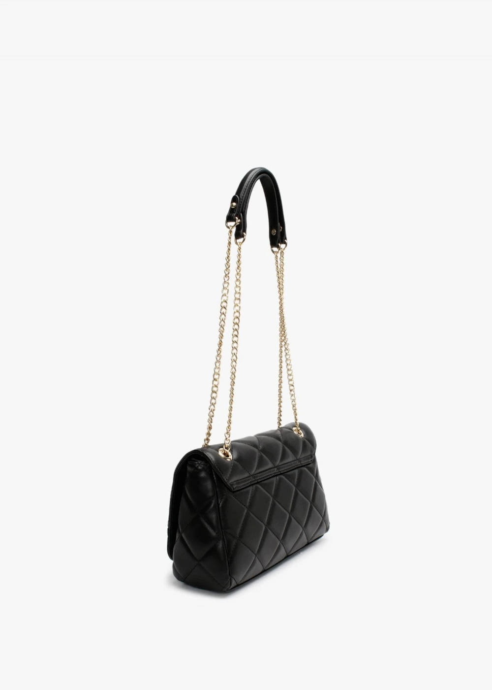 Add the ‘Ada’ satchel bag from Valentino Bags to your handbag collection. This timeless style is crafted from premium PU in a classic quilted design with gold tone accents. The secure push lock front flap reveals a zip and handy inner compartments. Carry by the adjustable strap on the shoulder or across the body. Signature Valentino Bags branding is seen throughout.