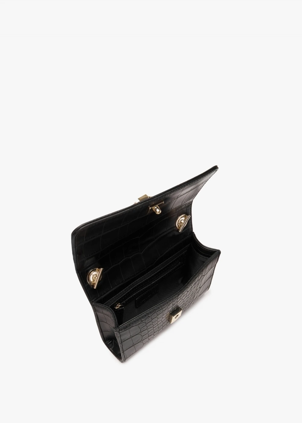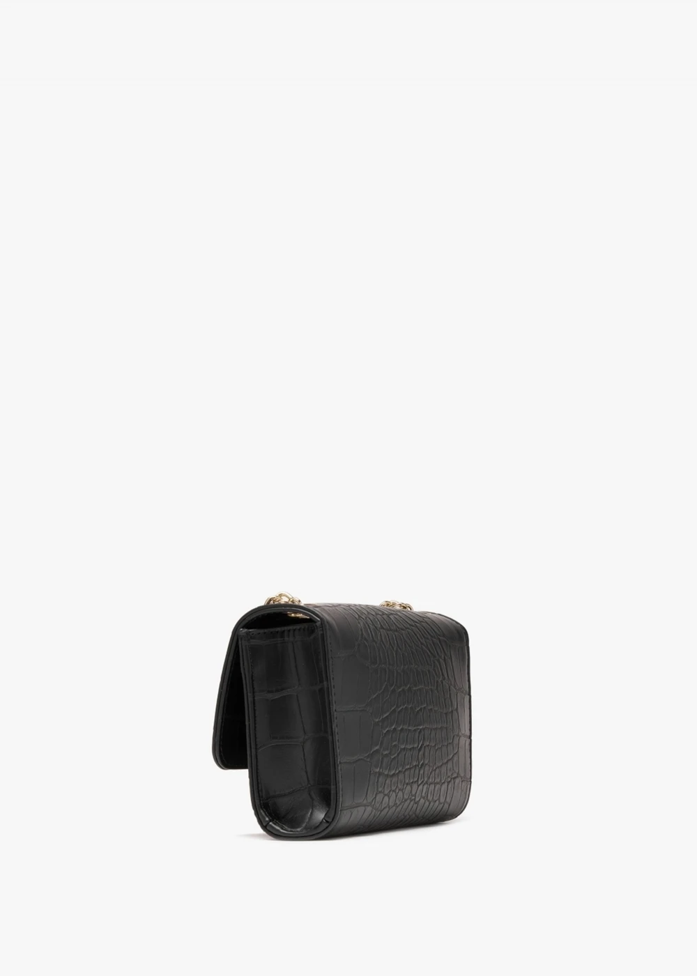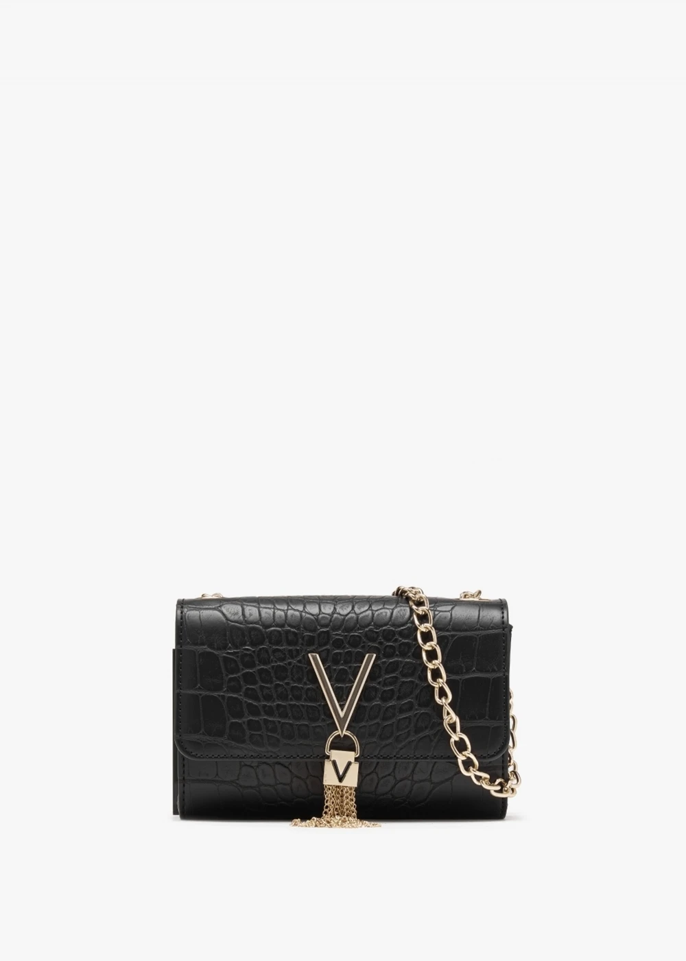 The ‘Audrey’ shoulder bag is part of the New Season collection from Valentino. This evening style is crafted from premium faux leather in a chic moc croc design with polished gold tone accents. Secure push lock fastening front flap reveals the main compartment featuring handy inner zip and slot pockets. Carry by the curb chain strap on the shoulder or across the body. Classic tassel and V logo add detail. Signature Valentino branding is seen throughout.
