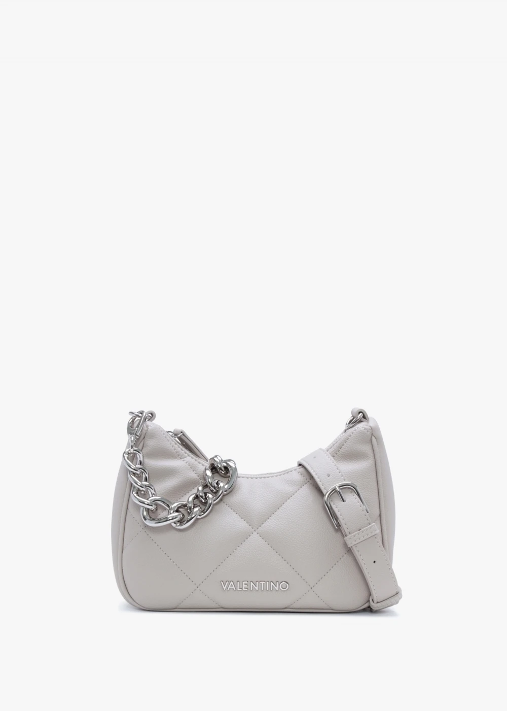 The ‘Cold’ cross-body bag from Valentino Bags eco-friendly collection is a versatile style. This New Season bag is crafted from premium pebbled PU in a classic quilted design with polished silver tone accents. The secure top zip fastening reveals the main compartment featuring handy inner zip and slot pockets. Carry by either of the detachable straps. Signature Valentino Bags branding is seen throughout.