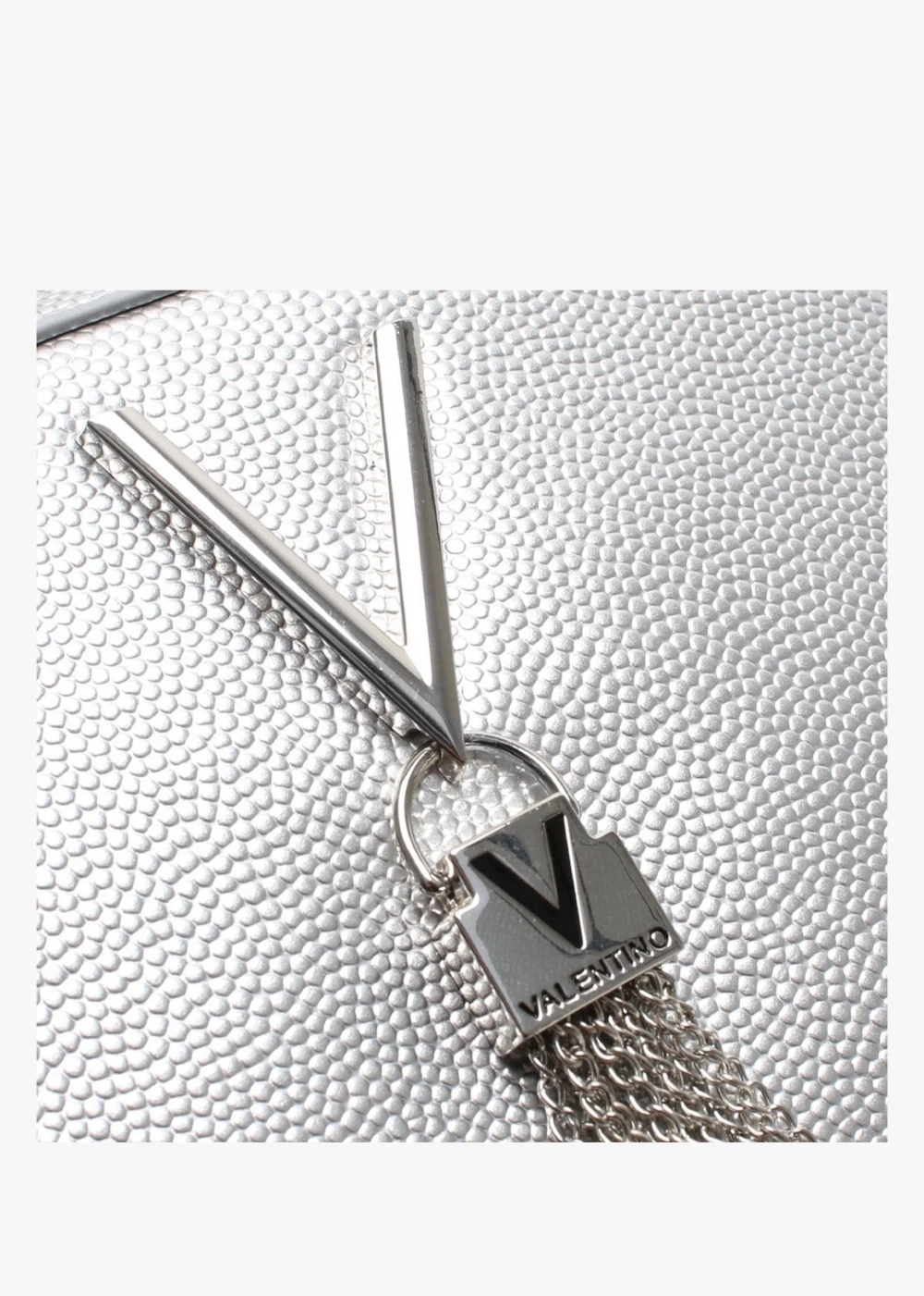 The ‘Divina’ camera bag is part of the New Season collection from Valentino Bags. This everyday style is crafted from premium faux leather in a pebbled design featuring polished silver tone hardware. Secure top zip fastening reveals multiple compartments. Carry on the shoulder or across the body for a hands free style. Signature Valentino Bags branding adds detail.