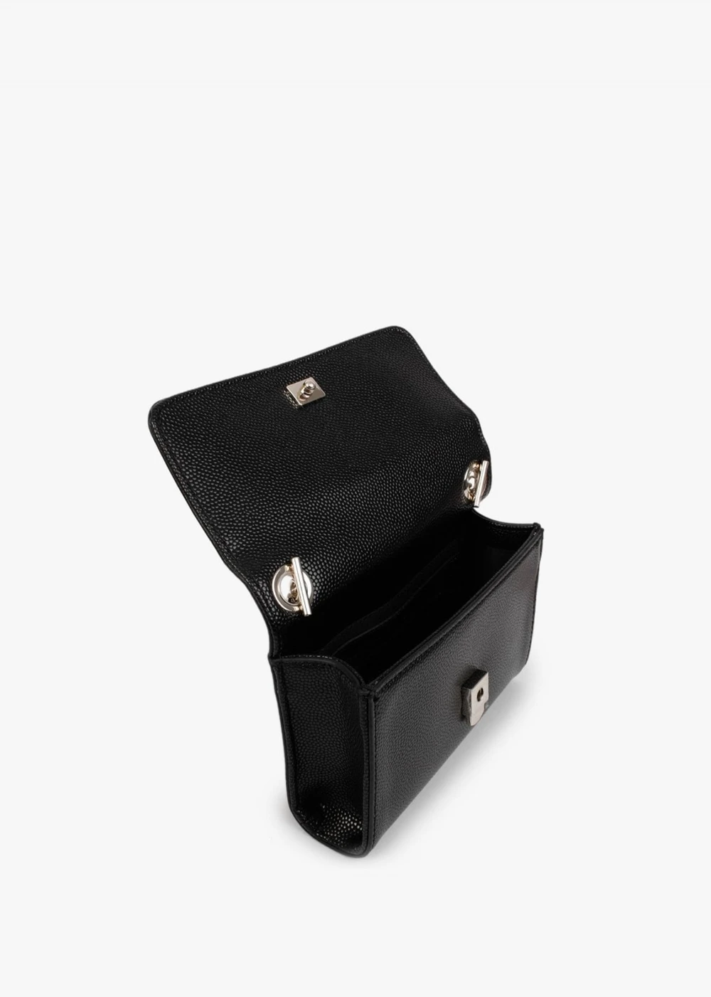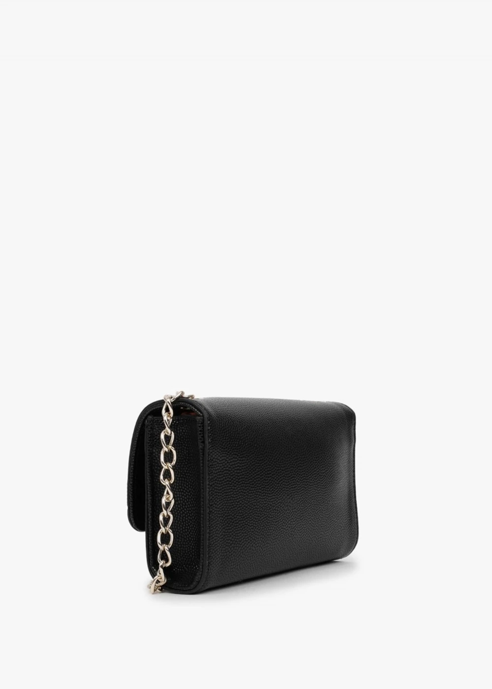 The ‘Divina’ shoulder bag is part of the New Season collection from Valentino Bags This evening style is crafted from premium faux leather in a pebbled design featuring polished gold tone hardware. Secure push lock fastening front flap reveals the main compartment featuring handy inner pockets. Carry by the curb chain strap on the shoulder or across the body. Signature Valentino Bags branding is seen throughout.