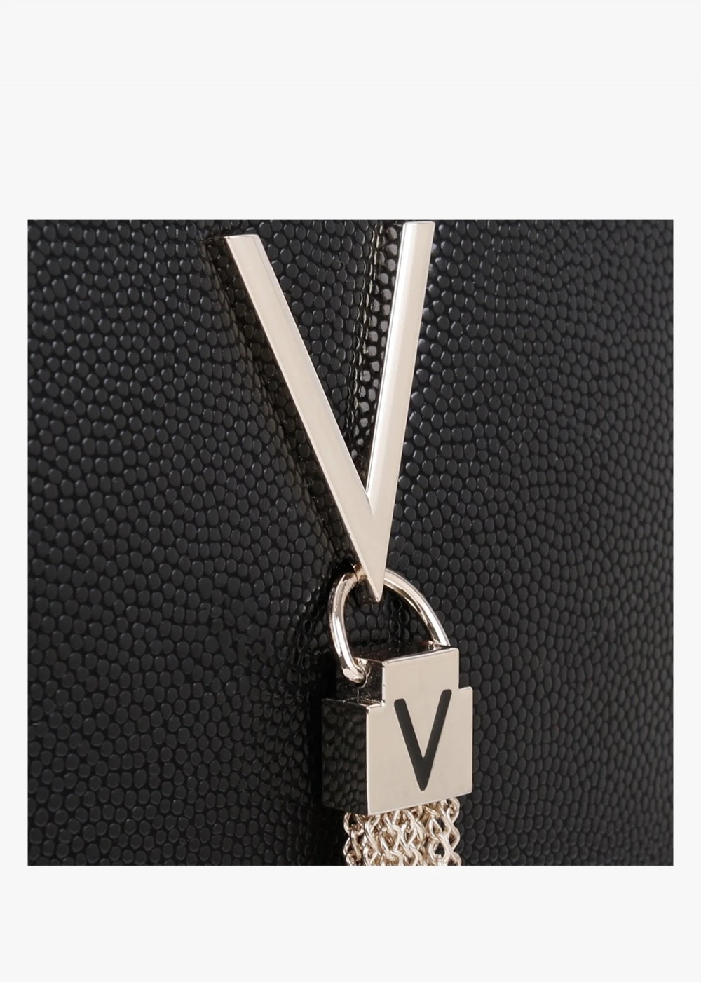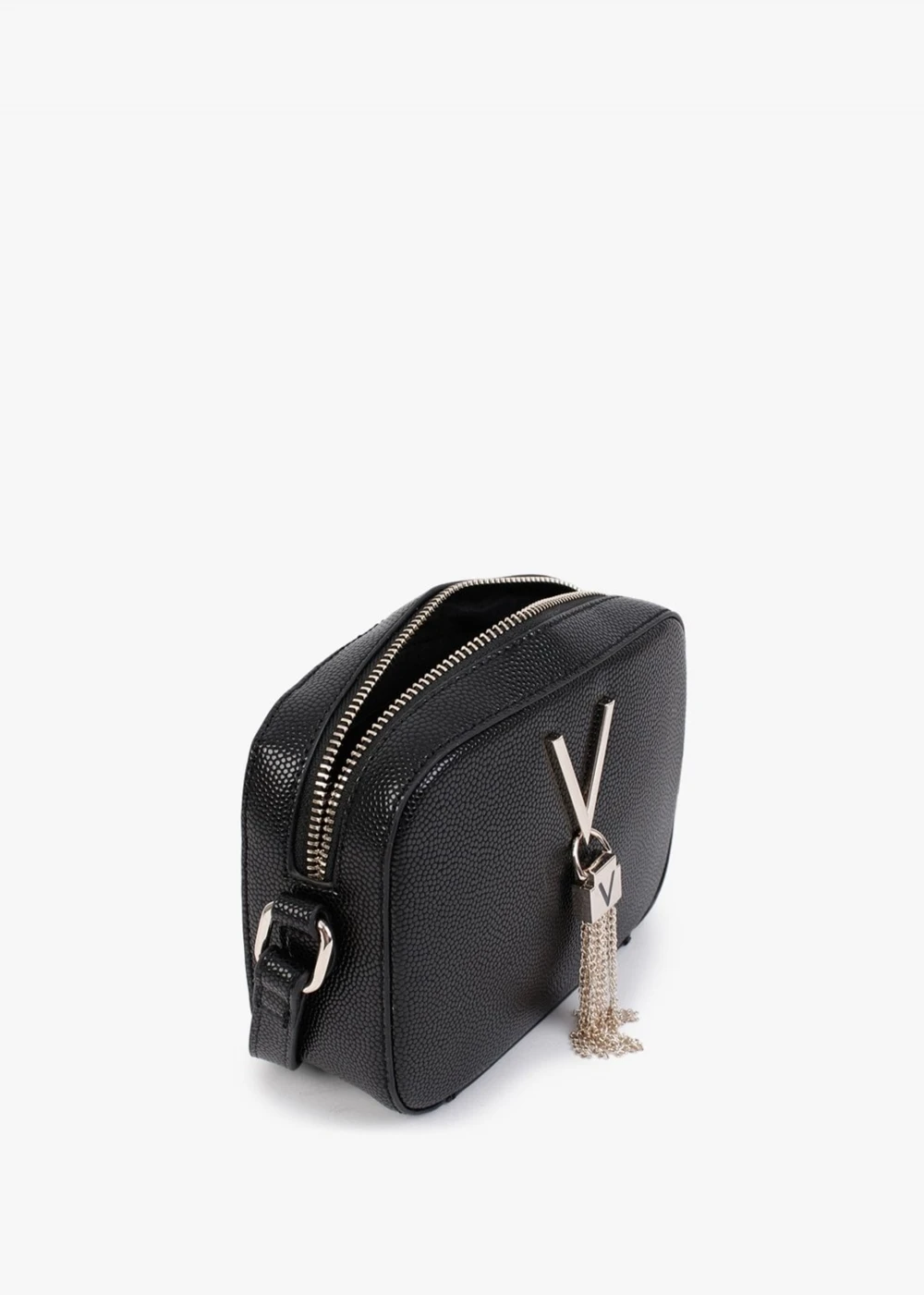 The ‘Divina’ camera bag is part of the New Season collection from Valentino. This everyday style is crafted from premium faux leather in a pebbled design featuring polished gold tone hardware. Secure top zip fastening reveals multiple compartments. Carry on the shoulder or across the body for a hands free style. Signature Valentino branding adds detail.