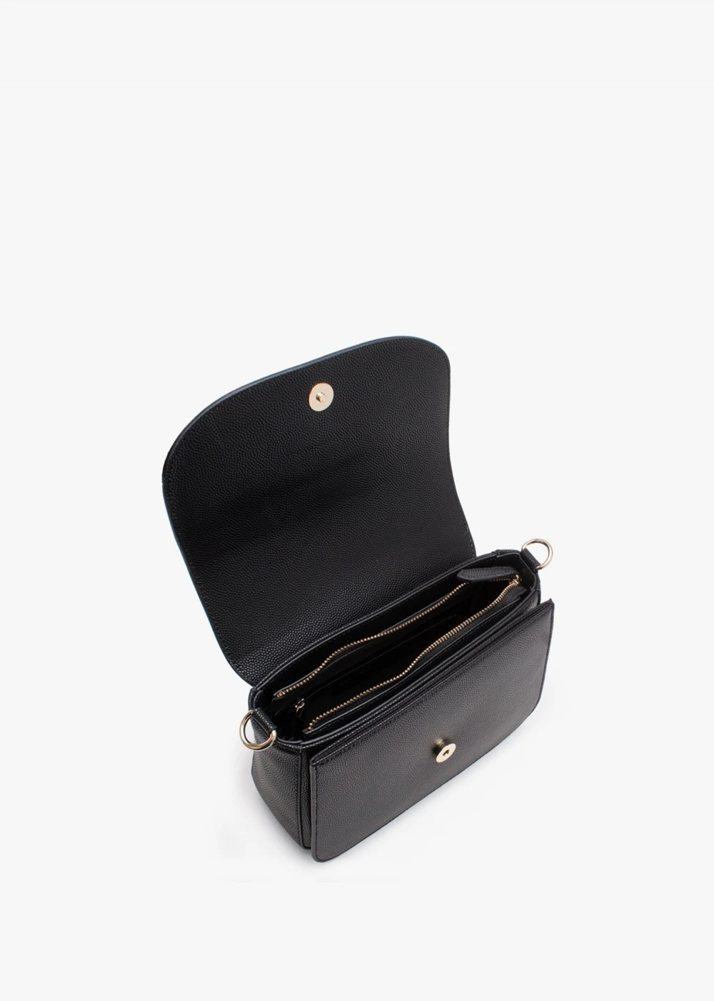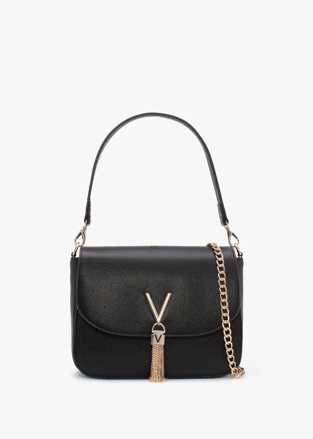 The ‘Divina’ large shoulder bag is part of the New Season collection from Valentino Bags. This everyday style is crafted from premium faux leather in a pebbled design featuring polished gold tone hardware. Secure push lock fastening front flap reveals multiple compartments. Carry by the double straps on the shoulder or across the body. Signature Valentino Bags branding adds detail.