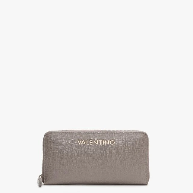 Add the ‘Divina’ wallet from Valentino Bag to your accessories collection. This New Season style is crafted from premium pebbled faux leather with gold tone accents. The secure zip around fastening reveals multiple compartments, ideal for stowing away all your coins, notes and cards. Signature Valentino Bags branding is seen throughout.