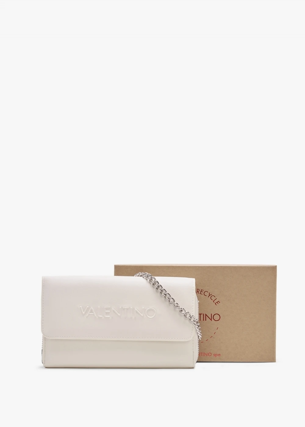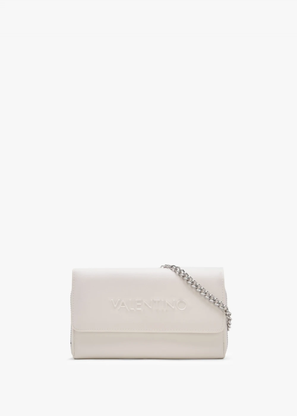 The ‘Holiday’ wallet on a chain is part of the New Season collection from Valentino Bags. This versatile style is crafted from premium PU with polished silver tone hardware. The secure popper fastening front flap reveals the concealed zip fastening compartment featuring handy inner pockets. The raised logo adds detail to the front flap. Carry by the detachable chain strap or detach and use as a classic large wallet. Signature Valentino Bag branding is seen throughout.