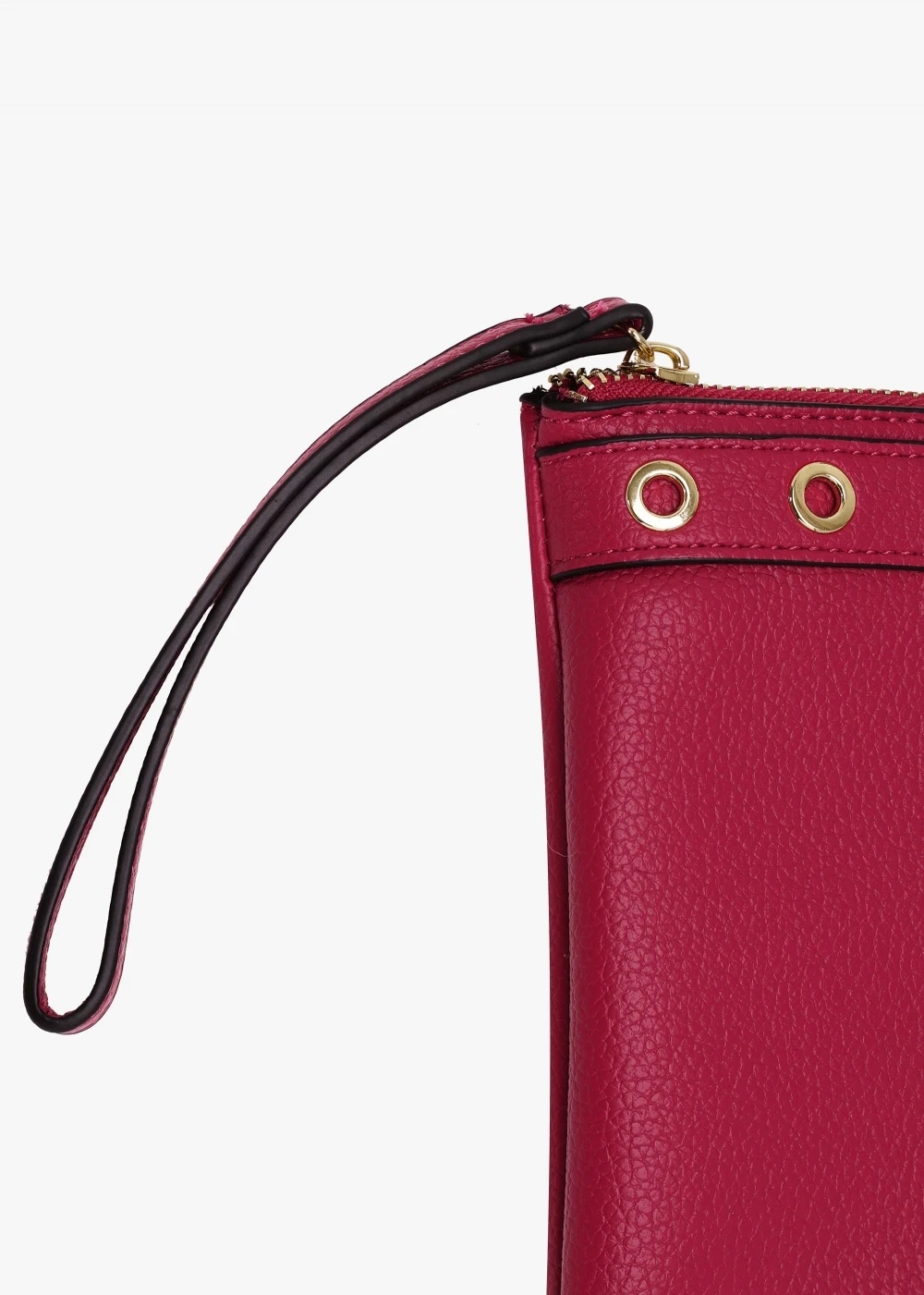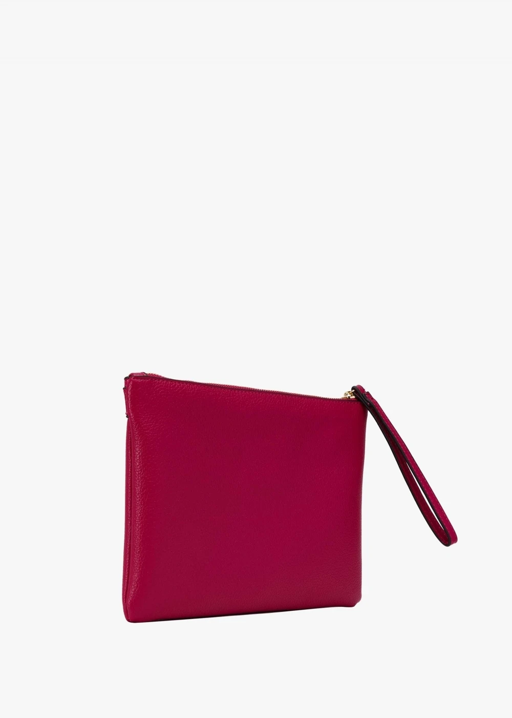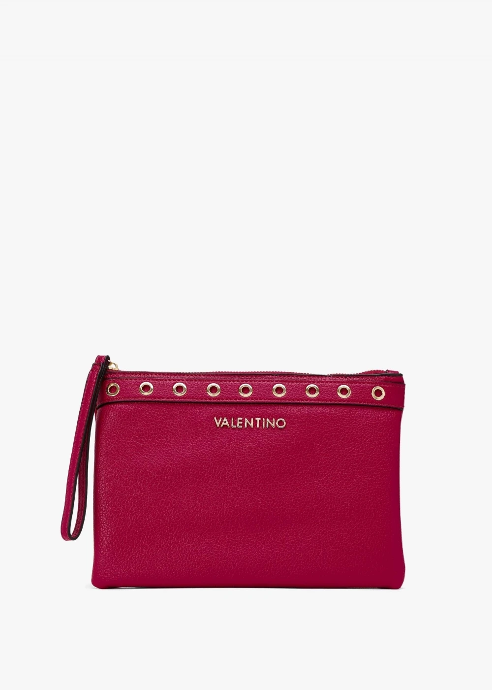 The ‘Megeve’ cosmetic pouch is part of the New Season collection from Valentino Bags. This versatile style is crafted from premium textured PU with polished gold tone accents. The secure top zip fastening reveals the main compartment and features handy inner zip and slot pockets. Carry by detachable wristlet strap. Edgy rivet embellishment adds detail. Use as a cosmetic pouch or an evening clutch. Signature Valentino Bags branding is seen throughout.