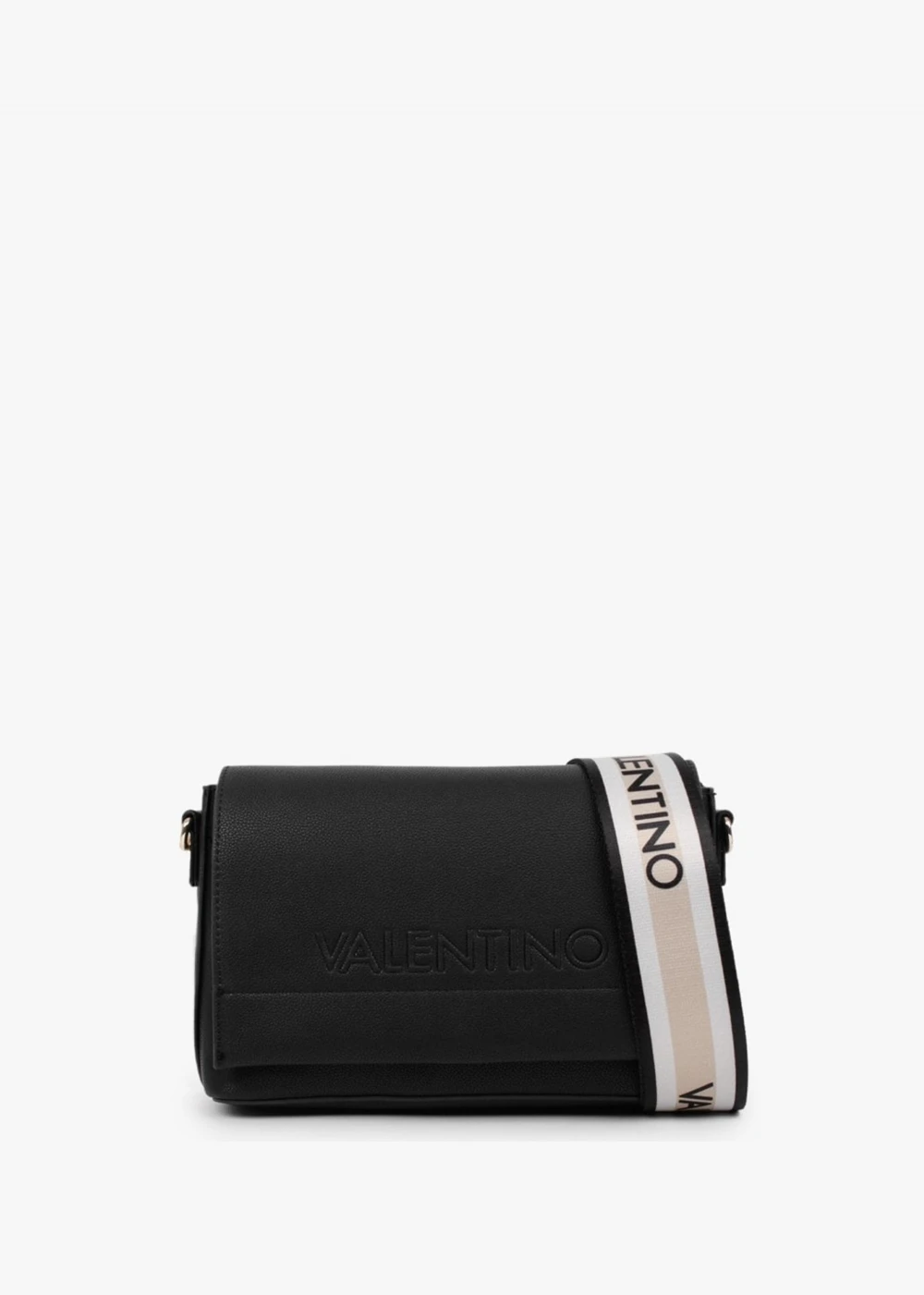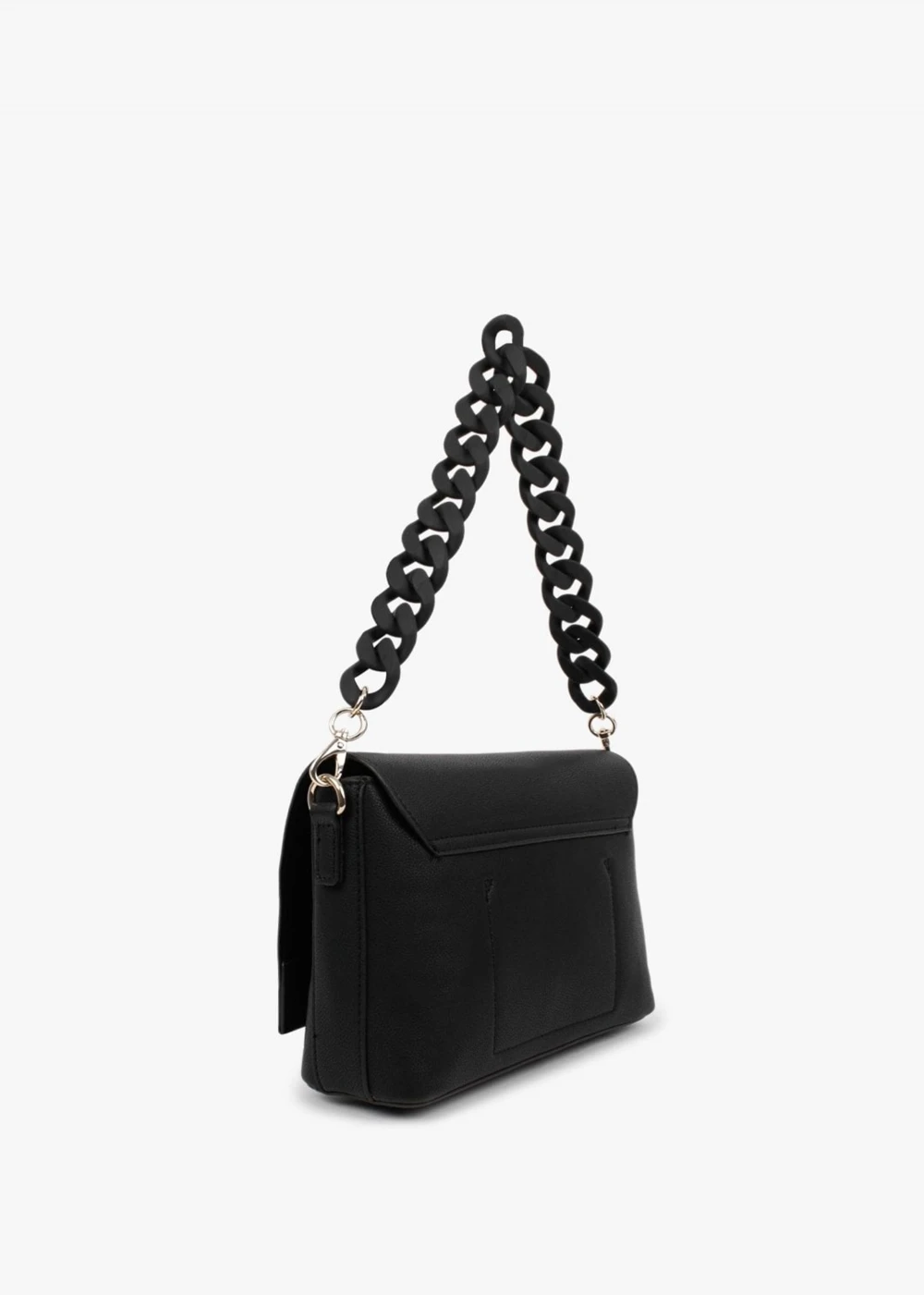The ‘Noodle’ cross-body bag is part of the New Season collection from Valentino Bags. This classic everyday style is crafted from premium textured PU with polished gold tone hardware. The secure magnetic snap front flap reveals the concealed top zip leading to the main compartment that features handy inner slot pocket. Carry by the detachable logo strap or the detachable rubber coated link chain strap. Raised logo adds detail to the front of the bag. Signature Valentino Bags branding is seen throughout.