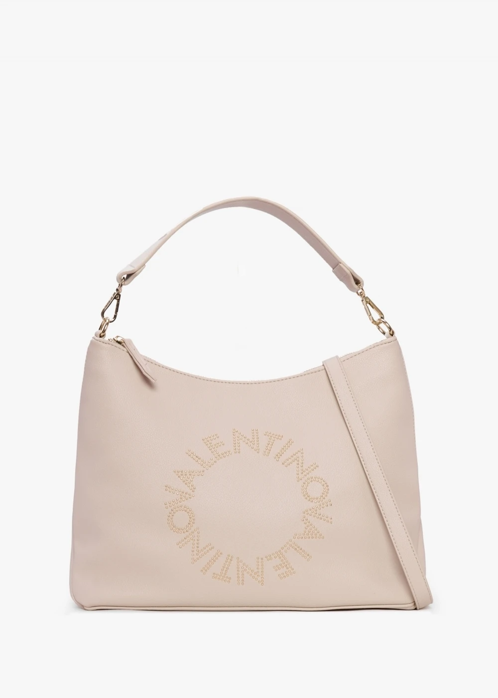 Add the spacious ‘Pie’ hobo bag from Valentino relove recycle collectionto your New Seaon wardrobe. This classic everyday style is crafted from premium PU in a textured design with polished gold tone accents. The secure top zip fastening reveals the main compartment and features handy inner zip and slot pockets. Carry by either of the detachable straps. Embellished studded logo adds detail. Signature Valentino branding is seen throughout.