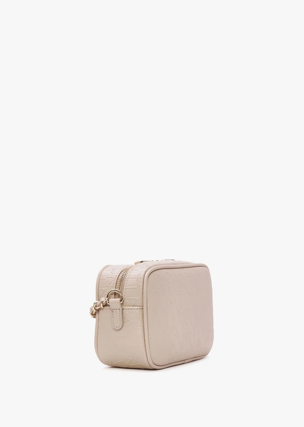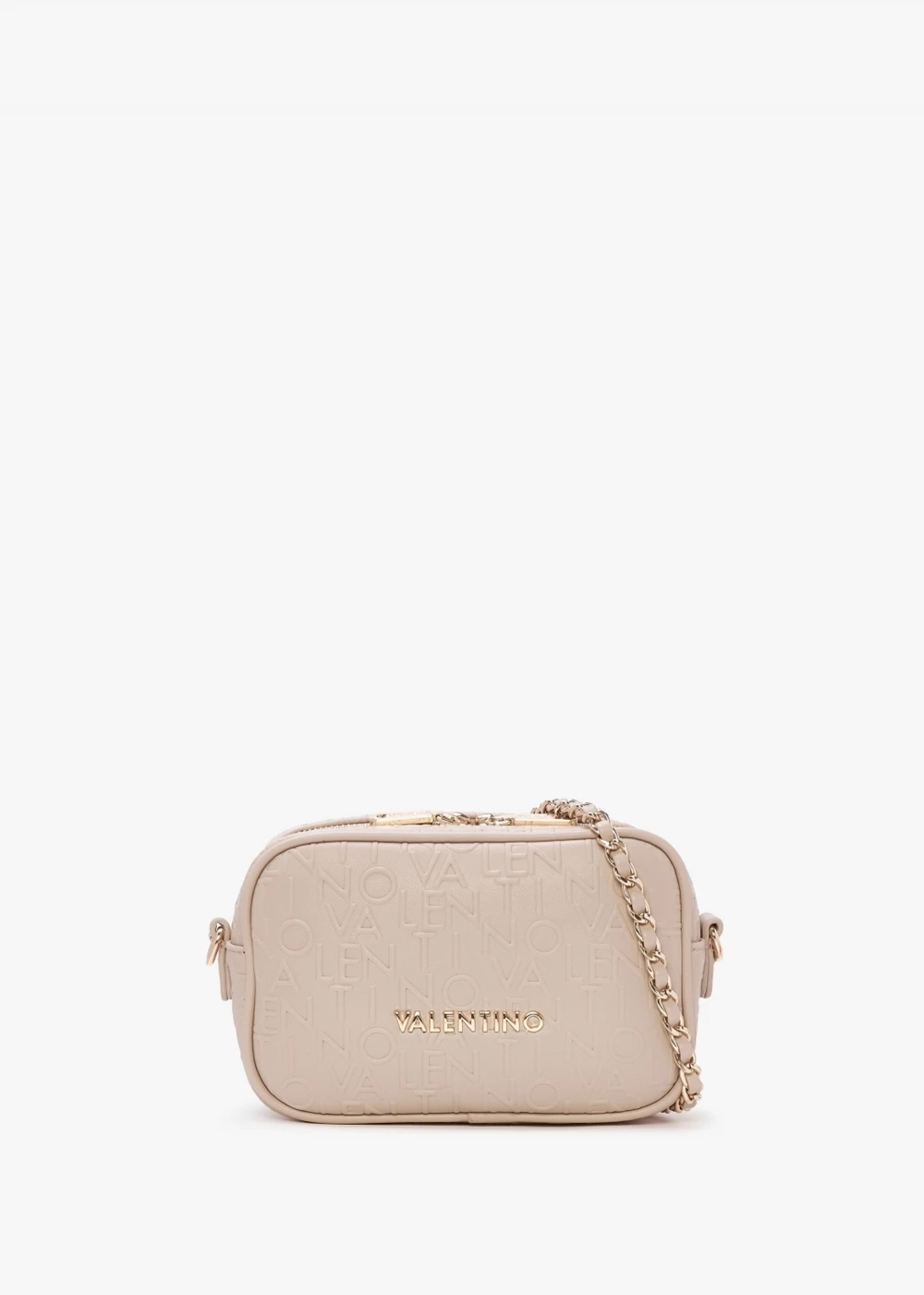 The ‘Relax’ camera bag is part of the New Season collection from Valentino. Crafted from premium PU in a repeat embossed logo design with polished gold tone hardware. The secure top zip fastening reveals the main compartment plus inner zip and slot pocket. Carry by the chain strap on the shoulder or across the body. Signature Valentino branding is seen throughout.