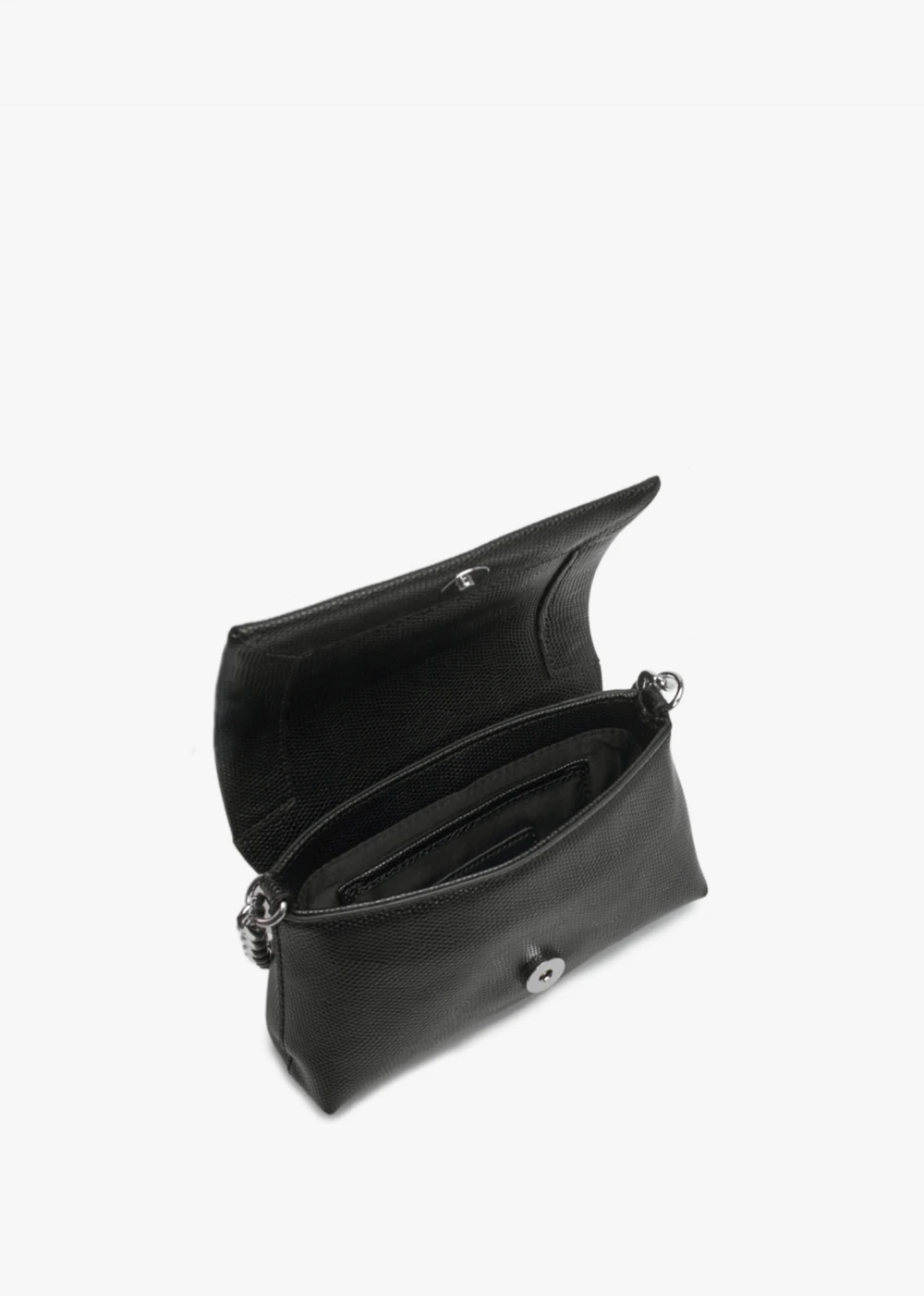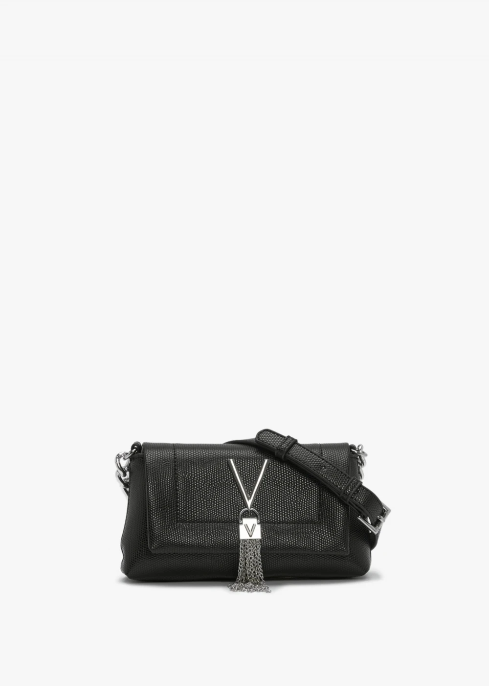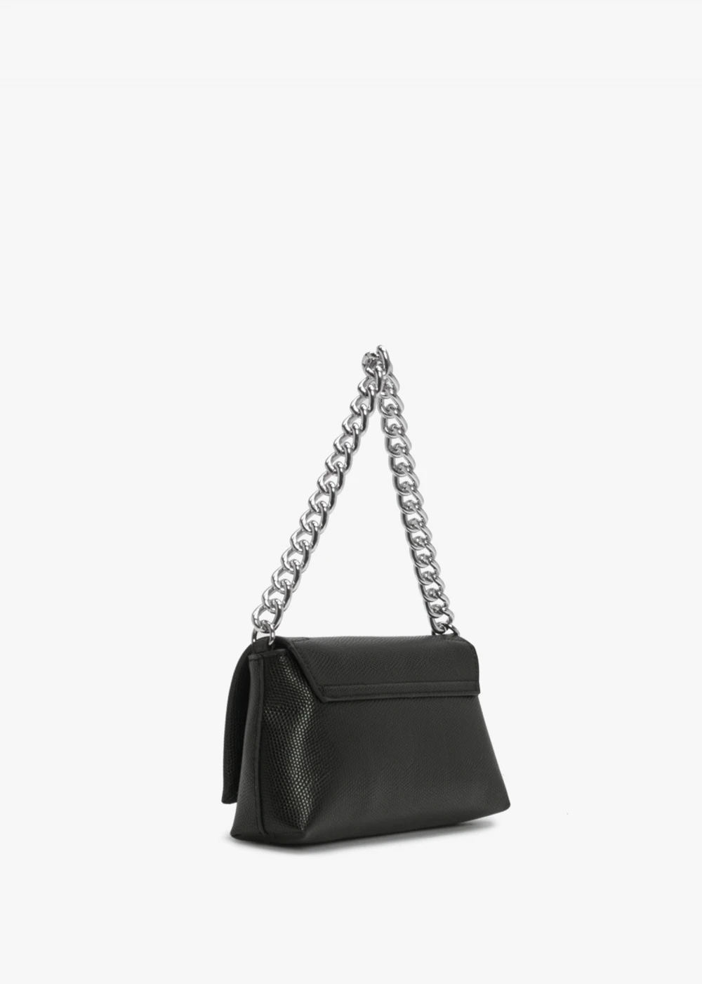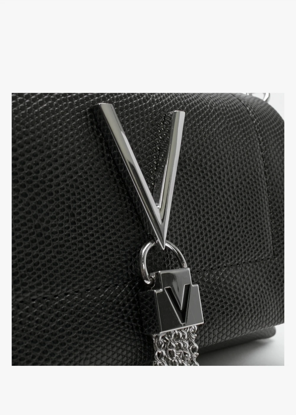 The ‘Small Oceania’ satchel bag is part of the New Season collection from Valentino Bags. This day to night style is part of Valentino Bags eco-friendly collection. Crafted from premium textured PU with polished silver tone accents. The secure magnetic snap front flap fastening reveals the main compartment with handy inner slot pocket. Carry by the chunky chain shoulder strap or the longer detachable strap. Classic ‘V’ logo with tassel adds detail to the front of the bag. Signature Valentino Bags branding is seen throughout.
