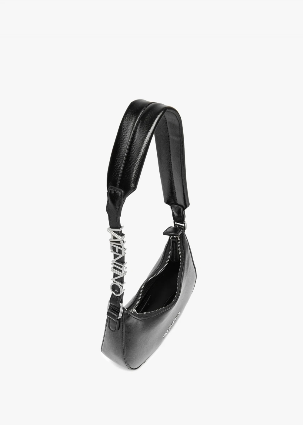 Add the ‘Vancouver’ shoulder bag from Valentino to your handbag collection. This New Season style is crafted from premium textured PU with polished silver tone accents. The secure top zip fastening reveals the main compartment and features handy inner zip and slot pockets. Carry by the logo adorned shoulder strap. Signature Valentino branding is seen throughout.
