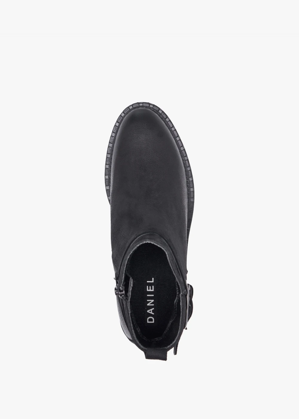 The ‘Venus’ ankle boots are part of the New Season collection from Daniel Footwear. A staple everyday style crafted from a premium leather upper with textile lining and a rubber sole. Zip fastening to the inner leg creates an easy wear. Tab to the top-line and buckle fastening strap adds detail. Signature Daniel branding is seen to the foot-bed.
