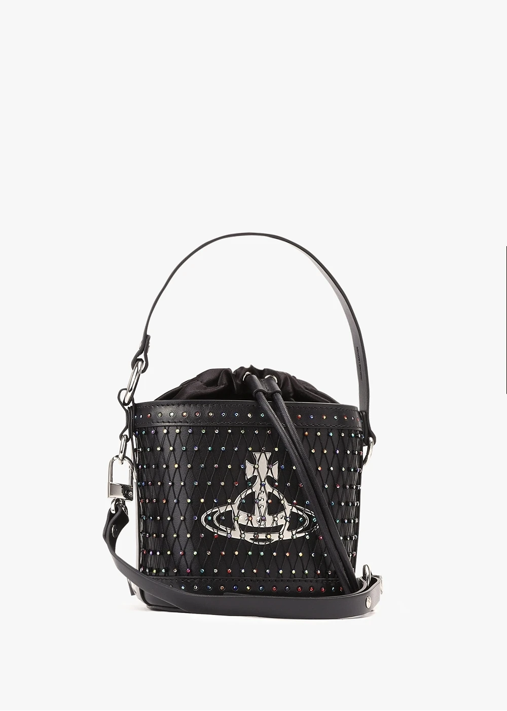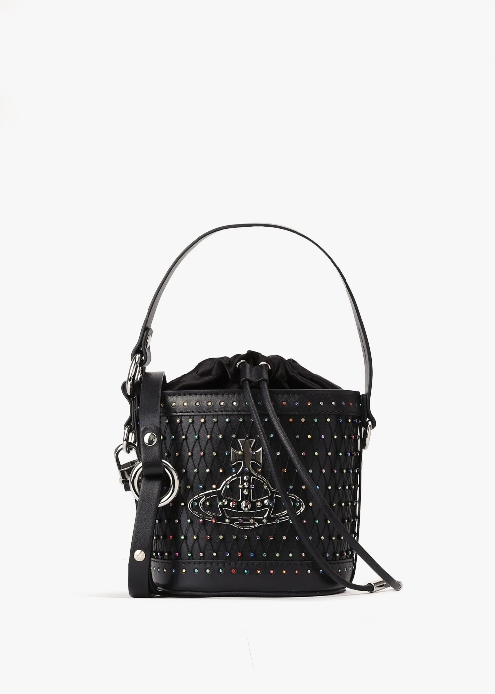 The perfect day to dark style- ‘Daisy Crystal Drawstring’ bucket bag from Vivienne Westwood. Crafted from premium cow hide leather with polished silver tone accents. The secure classic drawstring fastening reveals the main compartment. Carry by the top handle or the detachable straps. Tonal crystal embellished netting adds detail as well as iconic ‘Orb’ motif. Signature Vivienne Westwood branding is seen throughout.