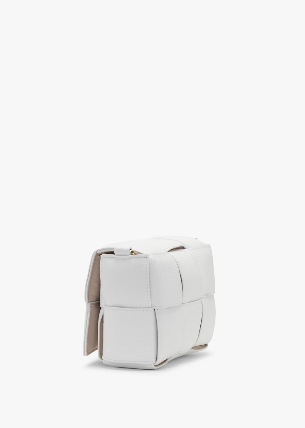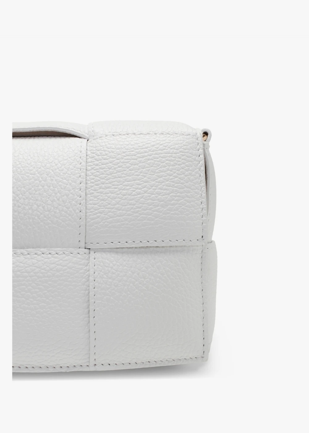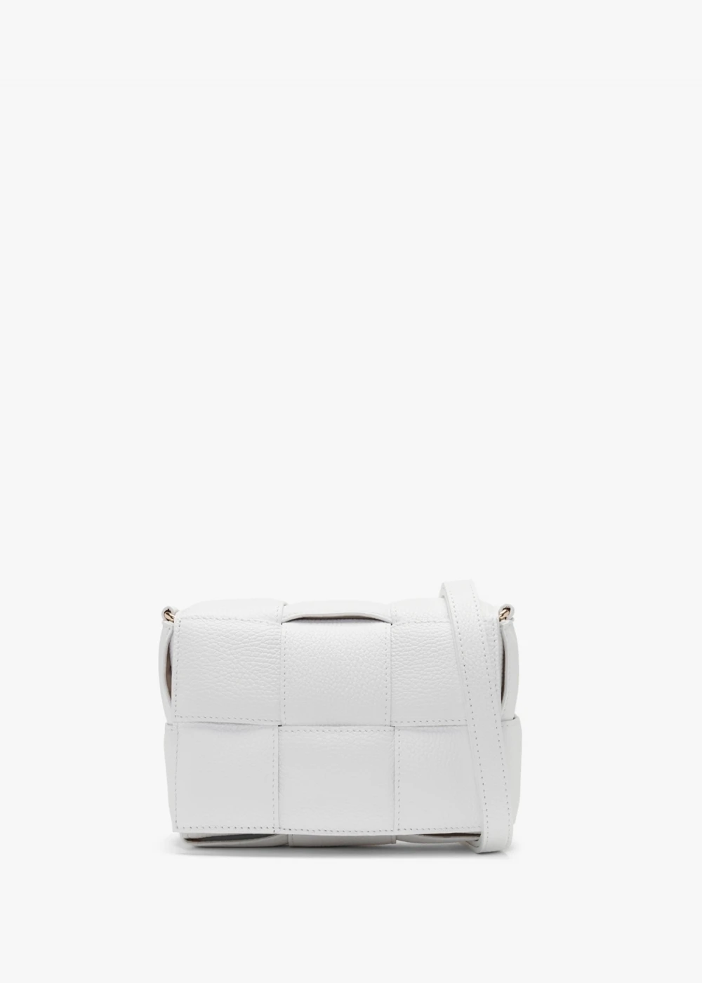 Add this New Season cross-body bag to your handbag collection. A day to night style crafted from premium pebbled leather in a woven padded pillow design with polished gold tone hardware. The secure push lock front flap reveals the main compartment featuring handy inner zip pocket. Carry by the detachable strap.