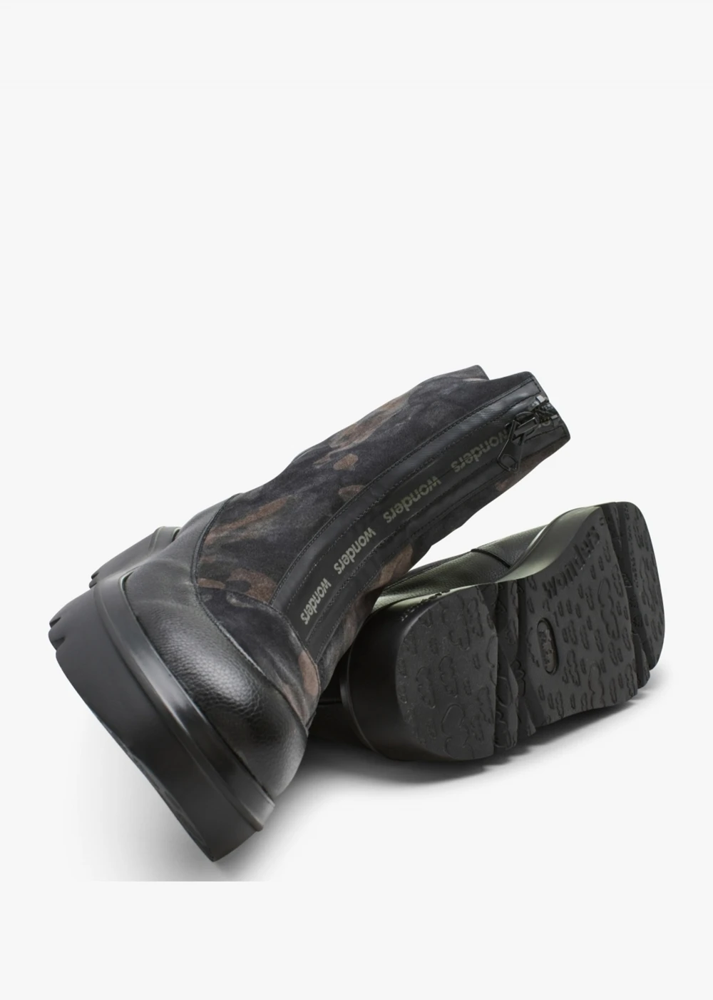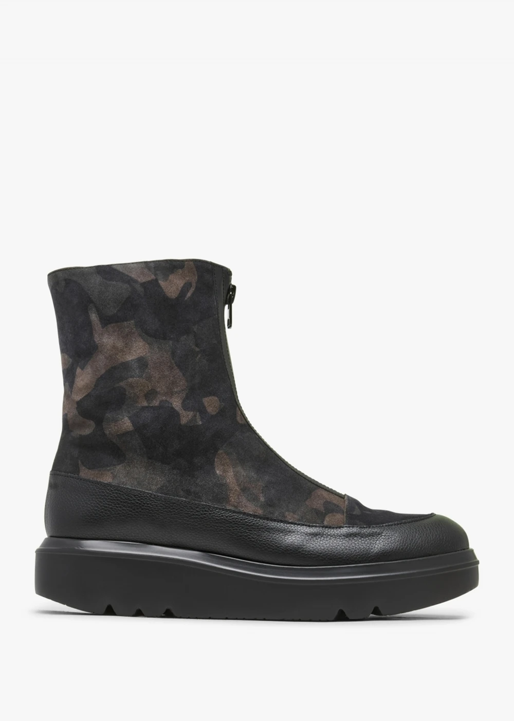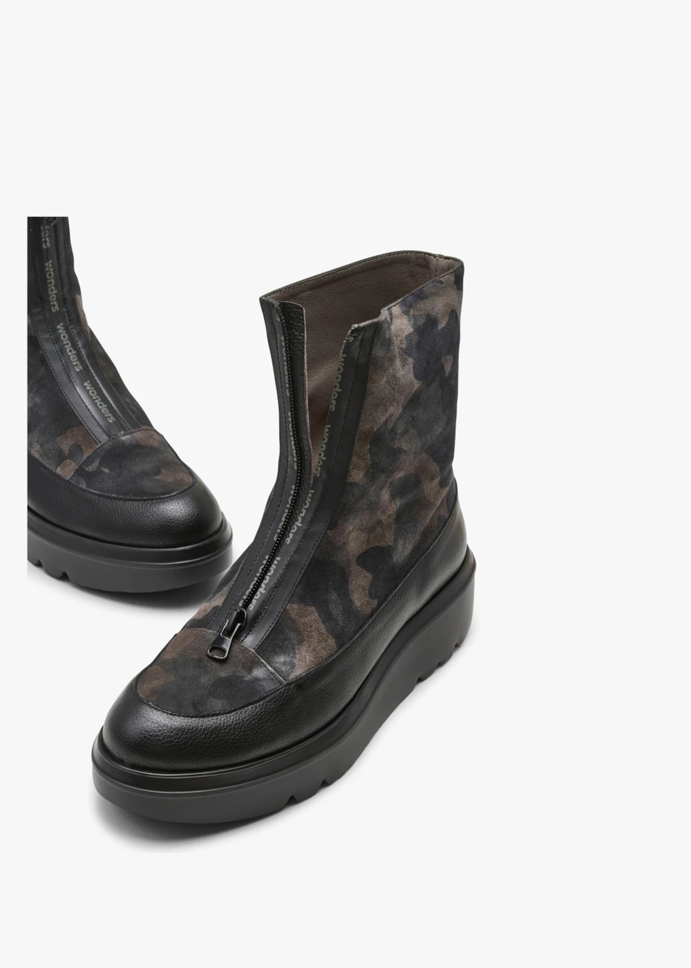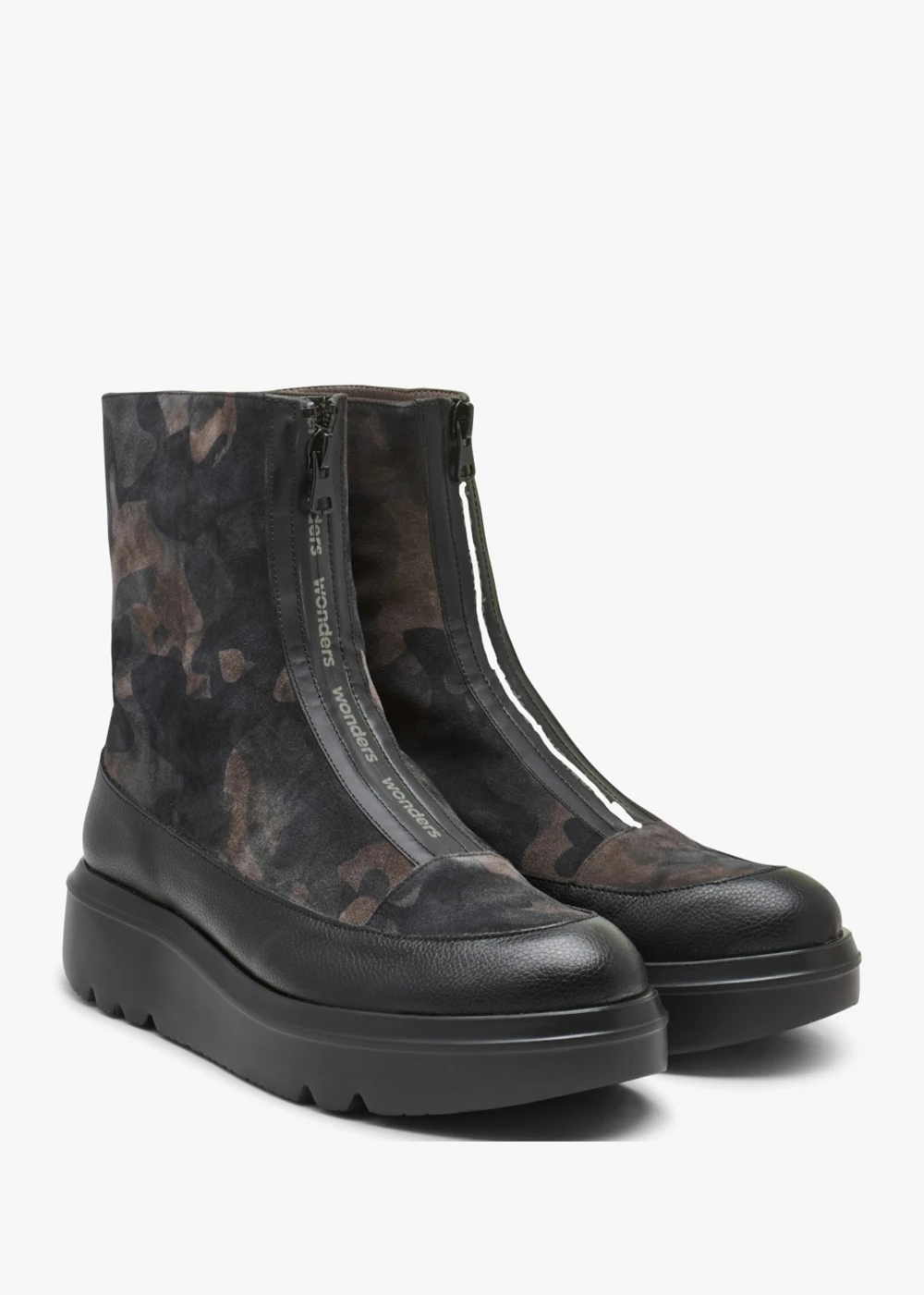 Add these ankle boots from Wonders to your boot collection. This New Season style is crafted from a premium suede upper in a tonal camo design with contrasting leather trim, leather lining and an extra light rubber sole. Zip fastening to the centre front creates an easy wear. Signature Wonders branding is seen to the foot-bed, zip and sole.